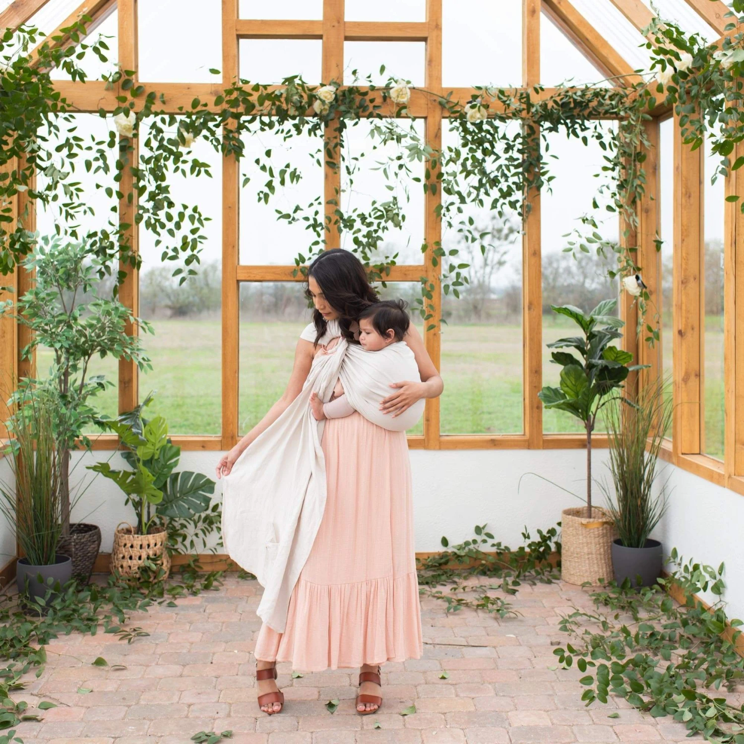 Our slings feature beautiful rose gold rings matching our forest-inspired colors perfectly. With two pockets, a large exterior pocket and a smaller interior one, there is space for all those extra items parents need such as cell phones and pacifiers!
